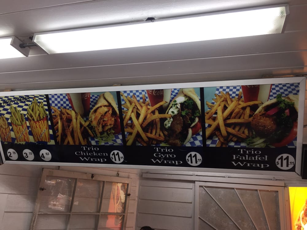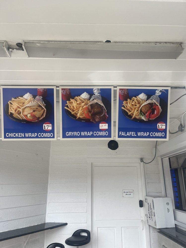 3 Pieces of Falafel wrapped in toasted pita with Hummus, tahini sauce, lettuce, tomato, pickles cabbage, white and red cabbage. Side of french fries with tzatziki garlic dip. Can of soft drink.